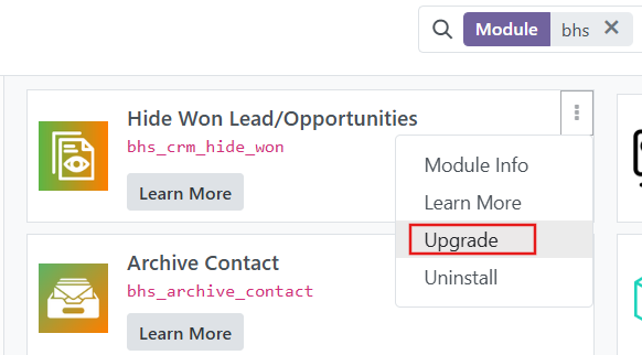 Đi đến Ứng dụng, nhấn chọn nút danh sách hành động (dấu ba chấm) bên cạnh thẻ của ứng dụng hoặc module bạn cần nâng cấp. Khi danh sách các hành động xổ xuống, hãy nhấn chọn Nâng cấp (Upgrade). Lúc này ứng dụng và module sẽ được tự động cập nhật những tính năng mới nhất.