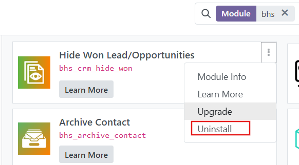 Đi đến Ứng dụng, nhấn chọn nút danh sách hành động (dấu ba chấm) bên cạnh thẻ của ứng dụng hoặc module, sau đó chọn Gỡ cài đặt (Uninstall)