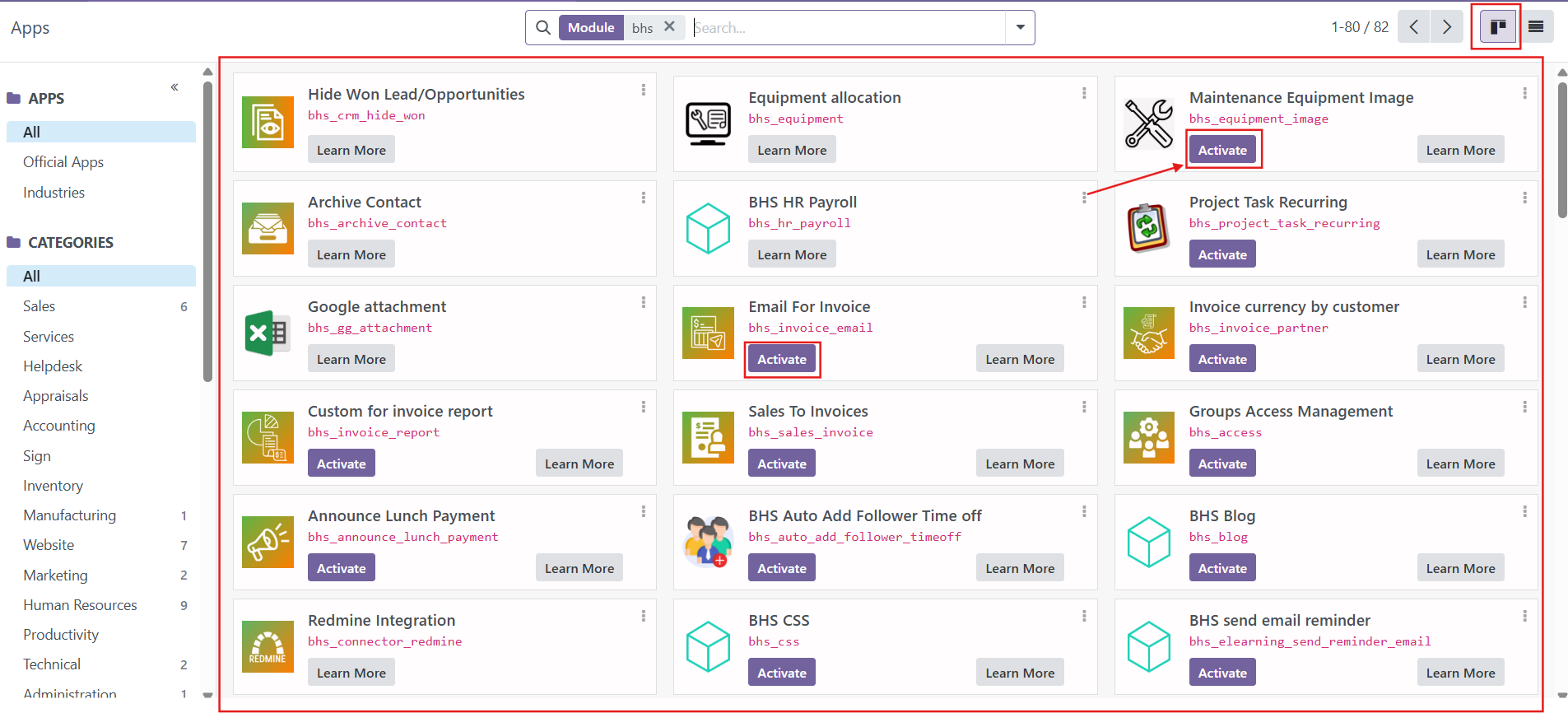- Dạng Kanban: Dạng xem mặc định của phần mềm, các ứng dụng và module được trình bày dưới dạng thẻ. Hãy ấn vào nút Kích hoạt (Active) trên từng thẻ để cài đặt ứng dụng và module bạn mong muốn.